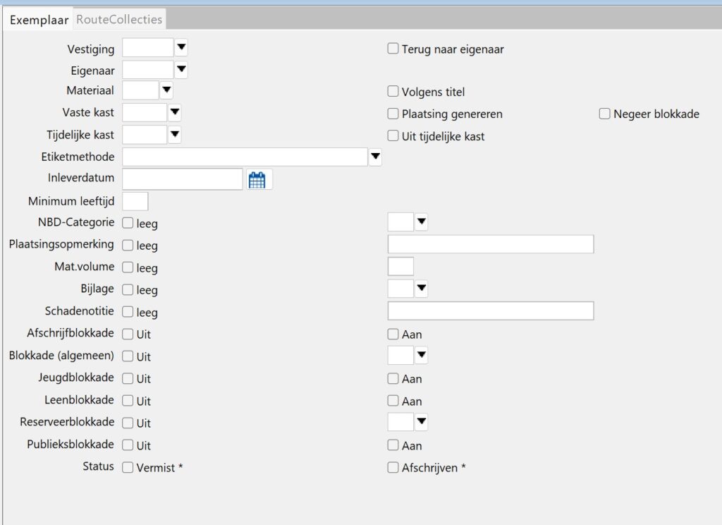 - Status (Vermist / Afschrijven): Je kan een exemplaar enkel afschrijven op deze manier wanneer het eerst de status Vermist heeft. We raden echter aan exemplaren af te schrijven via de functie “Exemplaren” > “Afschrijven”.