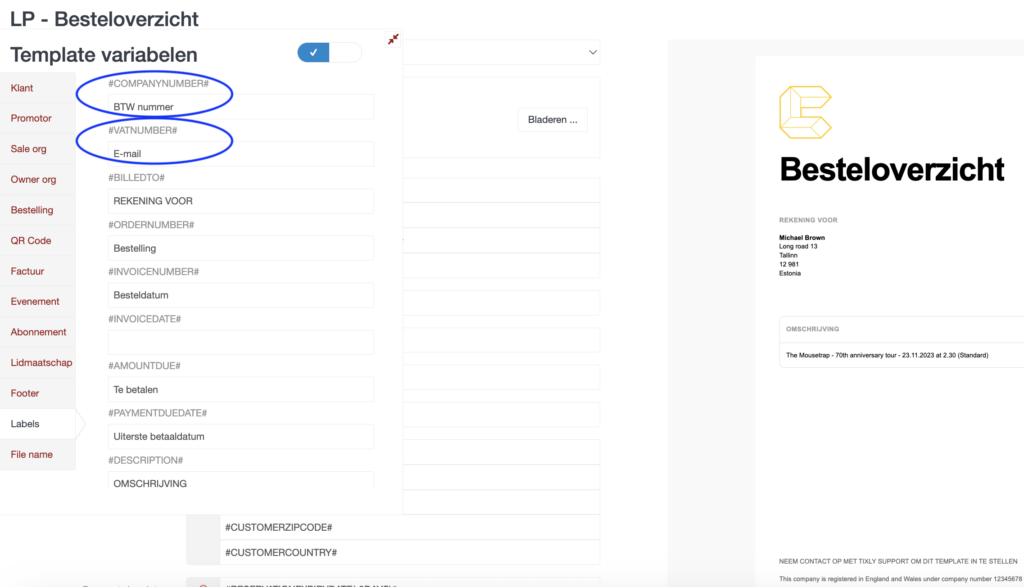 • Labels > #companynumber# = tekst ‘BTW nummer’ invullen
