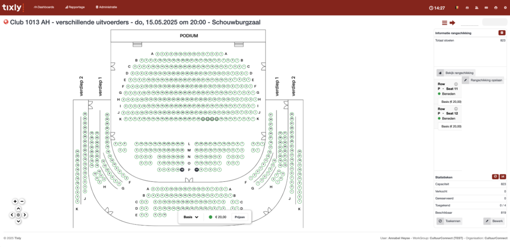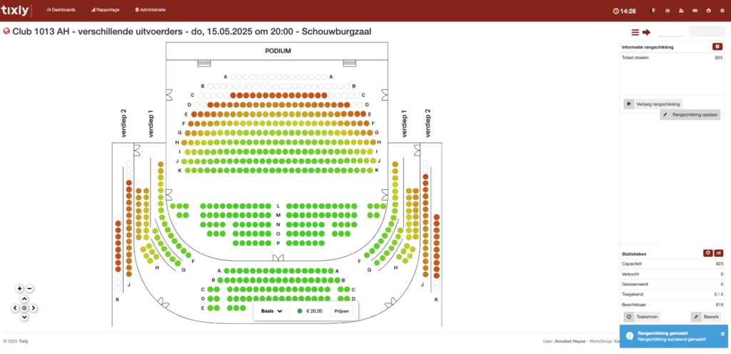 Met de rangschikking in Tixly bepaal je welke stoelen in een zaal de beste zichtlijnen hebben. Dit helpt bij de automatische toewijzing van plaatsen aan klanten in de online verkoop, zodat zij de best beschikbare plekken krijgen op basis van jouw ingestelde rangorde. De klant krijgt deze rangschikking zelf nooit te zien.