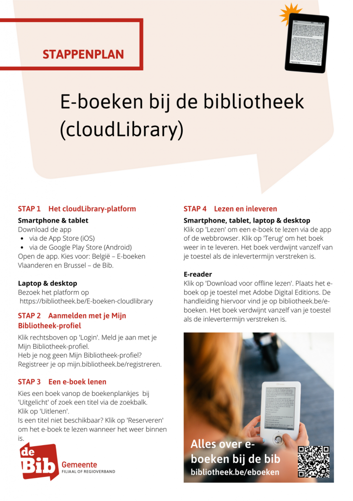 Je vindt rechts onderaan in de foto een QR-code die linkt naar de e-boekenpagina op de Vlaamse catalogus. Heb je liever dat de koppeling verwijst naar je eigen infopagina e-boeken, dan kan dat. Hiervoor moet je de code op het sjabloon aanpassen. Dit doe je zo: