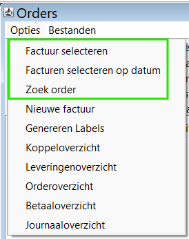 Ga naar de Orderadministratie en zoek de bijhorende factuur op via “Zoek order”, “Factuur selecteren”, of op datum via “Facturen selecteren op datum”.