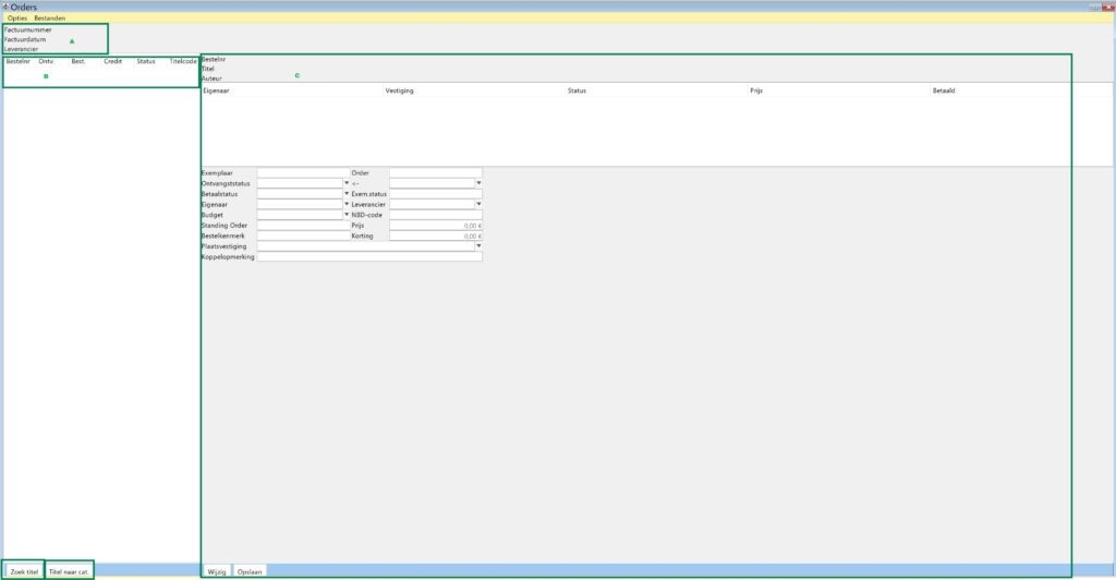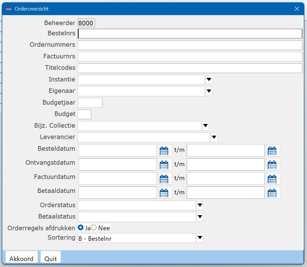 | Orderstatus | B – Besteld C – Gecrediteerd K – Gekoppeld (icm systeemoptie BST2GBK; deze parameter staat voor alle Vl & Br bibliotheken ingesteld aangezien wij geen echte facturen inlezen) O – Ontvangen V – Vervallen |