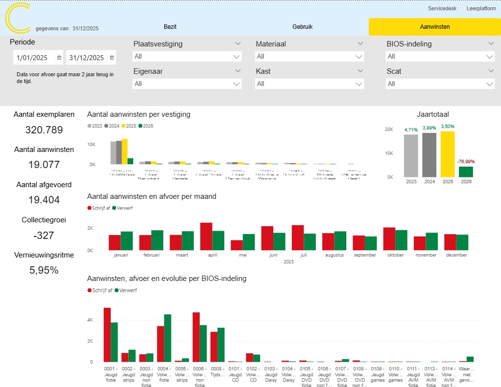 - Het tabblad “Aanwinsten” geeft een overzicht van het aantal nieuwe en afgeschreven exemplaren