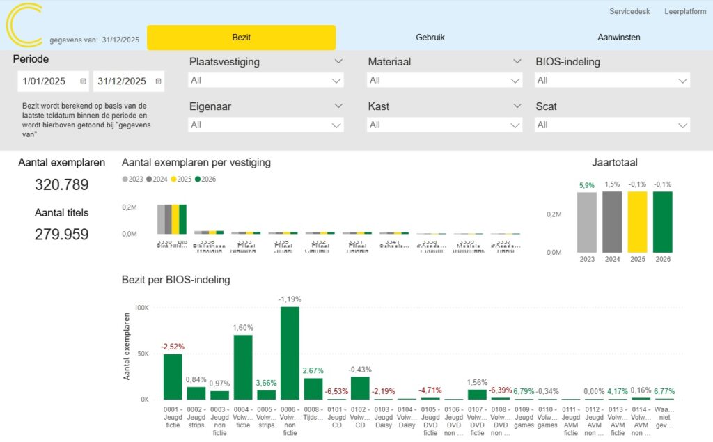 Het tabblad Bezit toont het aantal exemplaren in bezit. De bovenste grafieken tonen een overzicht per vestiging en voor de hele instantie voor de laatste vier kalenderjaren (telkens berekend voor de laatste kalenderdag).