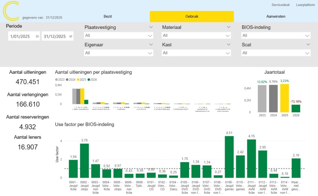 - Use factor = totaal aantal uitleningen binnen de periode gedeeld door het bezit