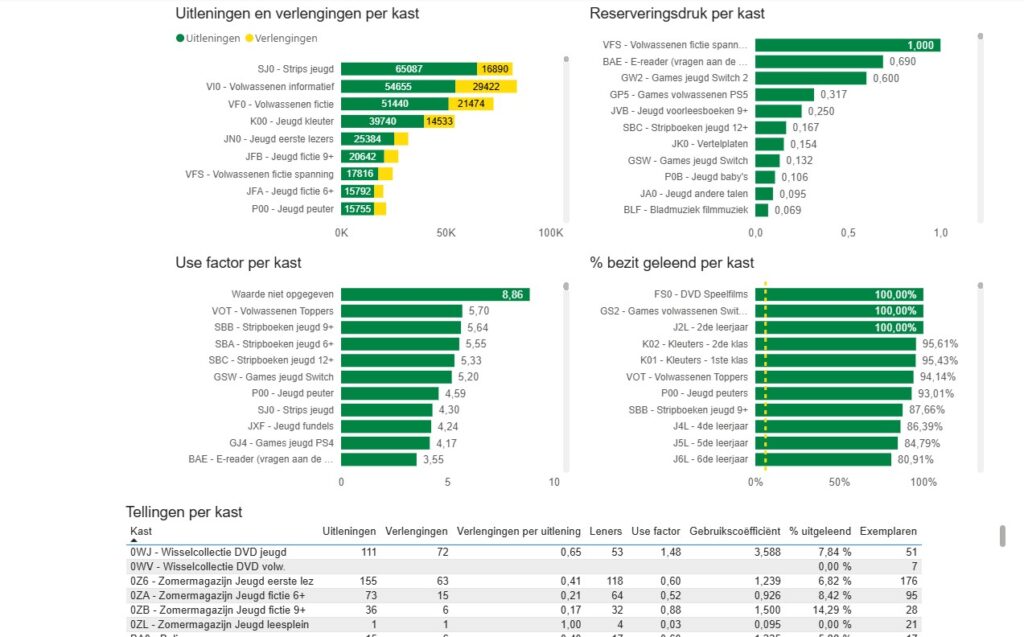 - Het tabblad “Gebruik” meet hoe goed de verschillende collectie-onderdelen gebruikt worden aan de hand van een aantal metrieken (uitleningen, use factor, reserveringsdruk, …)