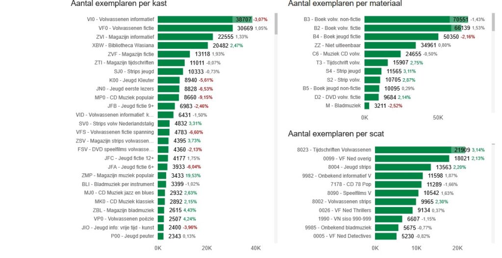 In de grafieken daaronder wordt het bezit berekend per BIOS-categorie, kast, materiaal en statistische categorie (scat). De aanduidingen in groen of rood duiden het verschil met het vorige jaar aan (stijging of daling in %).