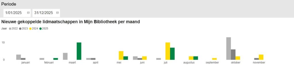 • “Nieuwe gekoppelde lidmaatschappen in Mijn Bibliotheek per maand” en “Acties in Mijn Bibliotheek” komen uit Mijn Bibliotheek. Deze cijfers worden maandelijks geüpdatet.
