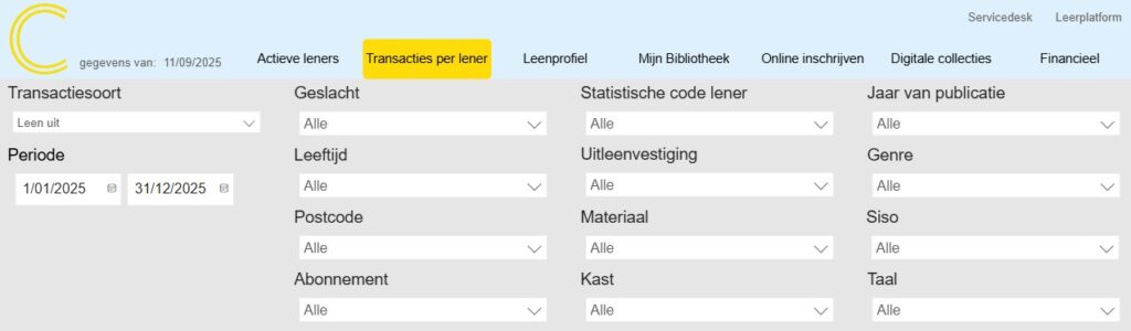 Transactiesoort: Filter om te kiezen op welke transactiesoort(en) het aantal leners geteld moet worden. Standaard “Leen uit”