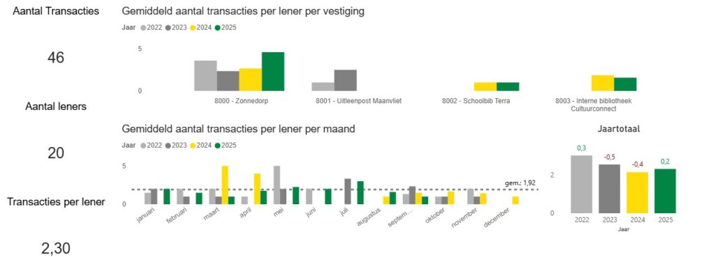 Dit tabblad toont het gemiddeld aantal transacties per lener in het geselecteerde kalenderjaar (totaal aantal transacties gedeeld door totaal aantal unieke leners).