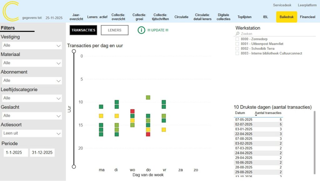 - 10 drukste dagen: Toont de 10 datums met het hoogste aantal transacties of leners voor de gehele dag, gesorteerd van hoog naar laag.
