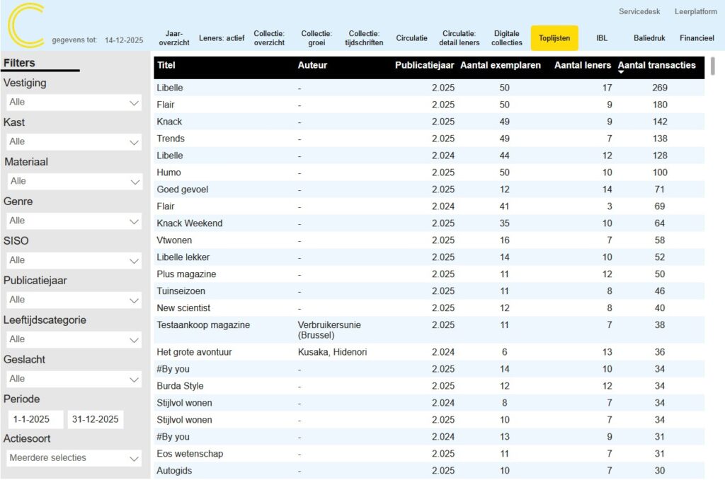 - Aantal leners: Uniek aantal leners die een transactie bij de titel hadden in de opgegeven periode.