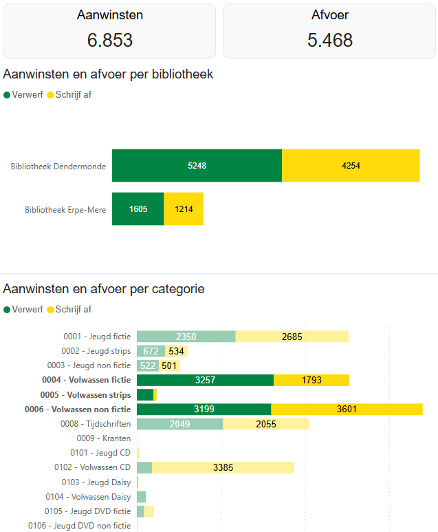 - het totaal aantal aanwinsten (Verwerf – groen) en afvoer (Schrijf af – geel) van alle gekozen bibliotheken