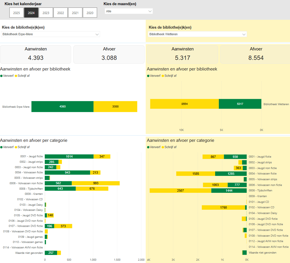 Aanwinsten en afvoer per bibliotheek: Aantal ingevoerde (groen) en afgeschreven (geel) bibliotheken per bibliotheek.