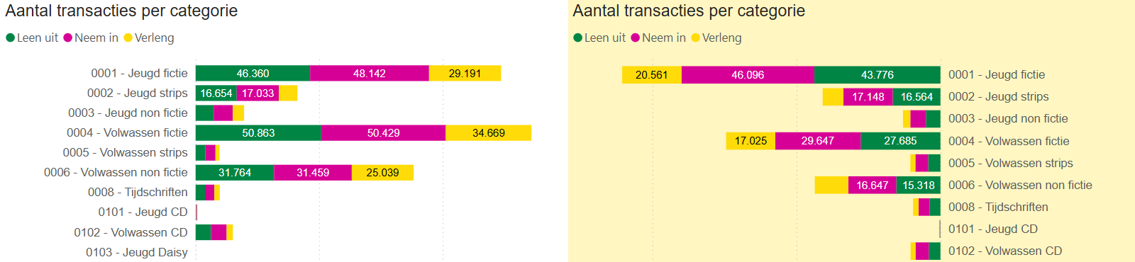 Aantal transacties per bibliotheek: toont het aantal geselecteerde transacties per bibliotheek, uitleningen in het groen, verlengingen in het geel en innames in het blauw. Standaard worden uitleningnen en verlengingen getoond. Met de filter op transactiesoort bovenaan kan gekozen worden voor uitleningen (Leen uit), innames (Neem in) en verlengingen (Verleng).