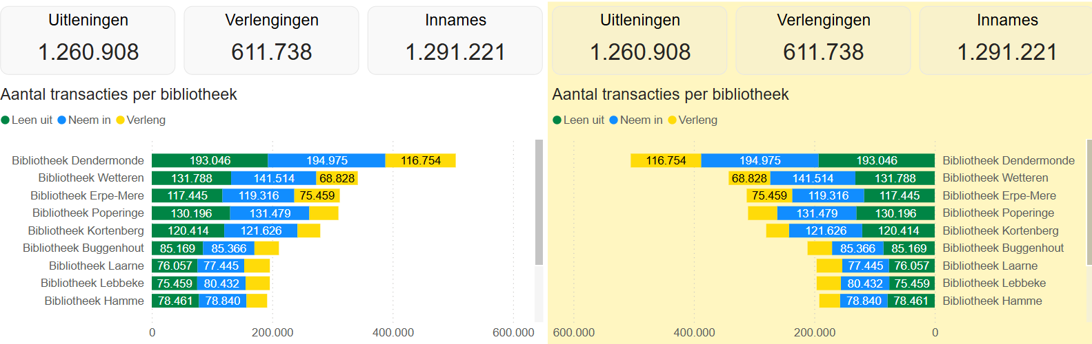 Aantal transacties per bibliotheek: toont het aantal geselecteerde transacties per bibliotheek, uitleningen in het groen, verlengingen in het geel en innames in het blauw. Standaard worden uitleningnen en verlengingen getoond. Met de filter op transactiesoort bovenaan kan gekozen worden voor uitleningen (Leen uit), innames (Neem in) en verlengingen (Verleng).