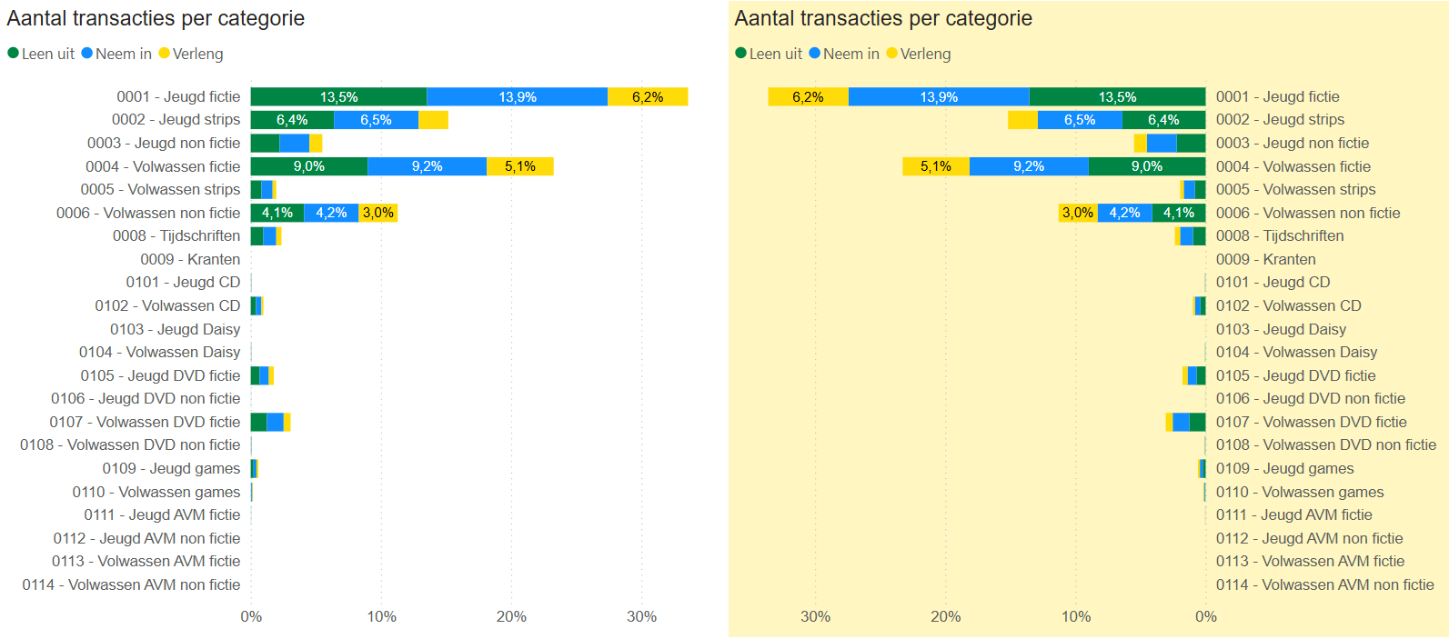 Aantal transacties per categorie: het totaal aantal transacties opgesplitst per BIOS-categorie. Deze categorie wordt berekend op basis van de titelgegevens (aard van het werk, materiaal, doelgroep, …) waaraan het exemplaar hangt en kan voor afwijkingen zorgen bij oudere en onvolledige titelbeschrijvingen. De aanduiding wordt in percentage van het totaal getoond. Wanneer meerdere transactiesoorten zijn geselecteerd dan is het percentage berekend over alle gekozen transactiesoorten van de geselecteerde bibliotheken. Wanneer je met de muis over de grafiek gaat, krijg je ook de absolute aantallen te zien.