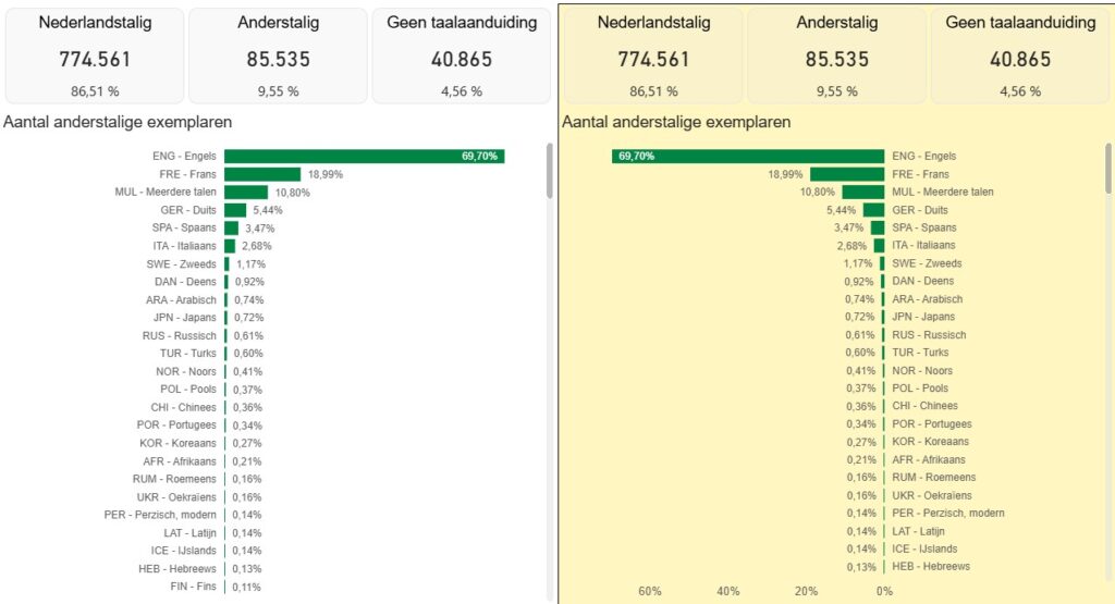 Aantal anderstalige exemplaren: Het aantal anderstalige exemplaren opgesplitst per taal. De aantallen worden als percentage van het totale aantal exemplaren getoond. Wanneer je met de muis over een balk gaat, krijg je ook het absolute aantal exemplaren te zien.