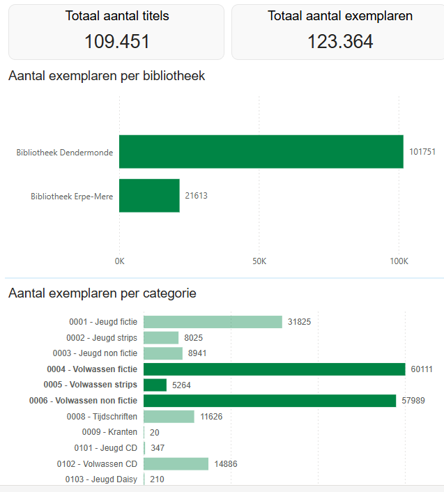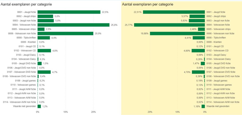 Aantal exemplaren per categorie: Totaal aantal exemplaren opgesplitst per BIOS-categorie. Deze categorie wordt berekend op basis van de titelgegevens (aard van het werk, materiaal, doelgroep, …) waaraan het exemplaar hangt en kan voor afwijkingen zorgen bij oudere en onvolledige titelbeschrijvingen. De aantallen worden als percentage van het totale aantal exemplaren getoond. Wanneer je met de muis over een balk gaat, krijg je ook het absolute aantal exemplaren te zien.