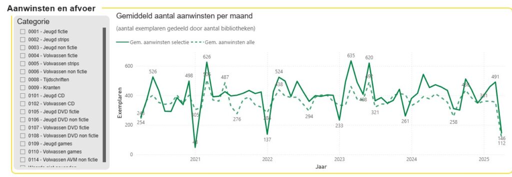 Gemiddeld aantal aanwinsten per maand: Toont het gemiddeld aantal nieuwe exemplaren per maand. De gestippelde lijn toont het gemiddelde berekend voor alle bibliotheken, de volle lijn het gemiddelde voor de geselecteerde bibliotheken.