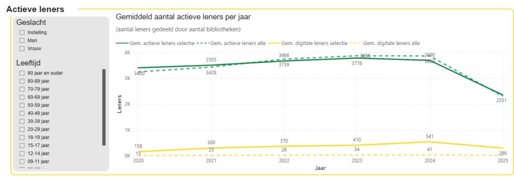 Gemiddeld aantal actieve leners per jaar: Toont het gemiddeld aantal actieve (groen) en digitale (geel) leners. De gestippelde lijn toont het gemiddelde berekend voor alle bibliotheken, de volle lijn het gemiddelde voor de geselecteerde bibliotheken.