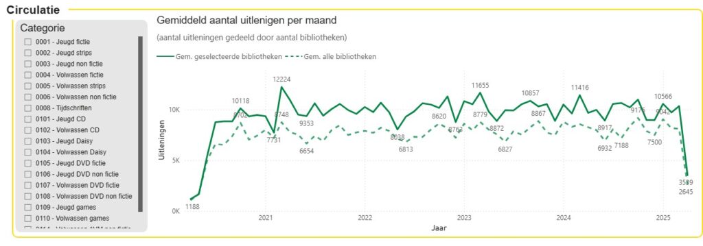 Gemiddeld aantal uitleningen per maand: Totaal aantal uitleningen voor elke maand gedeeld door het aantal bibliotheken. De gestippelde lijn toont het gemiddelde berekend voor alle bibliotheken, de volle lijn het gemiddelde voor de geselecteerde bibliotheken.