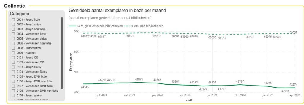 Gemiddeld aantal exemplaren in bezit per maand: Toont het gemiddeld aantal exemplaren in bezit op de laatste dag van de maand. De gestippelde lijn toont het gemiddelde berekend voor alle bibliotheken, de volle lijn het gemiddelde voor de geselecteerde bibliotheken.