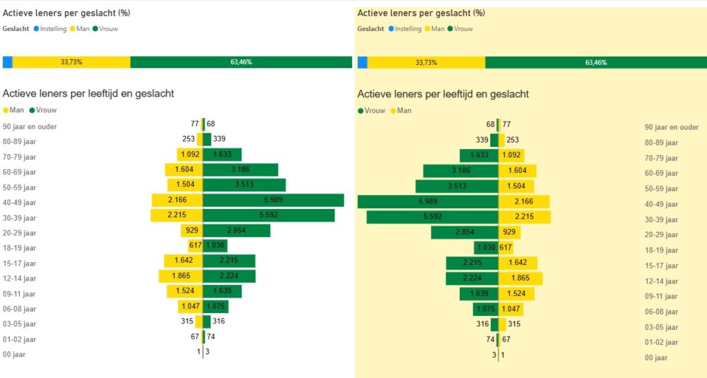 Leners per geslacht (%): de verhouding per geslacht voor alle leners van de geselecteerde bibliotheken in percent van het totaal: Instelling in het blauw, Man in het geel en Vrouw in het groen.