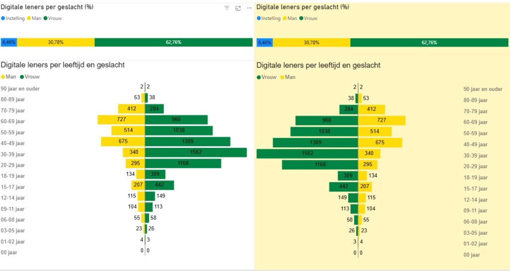 Digitale leners per geslacht (%): de verhouding per geslacht voor alle leners van de geselecteerde bibliotheken in percent van het totaal: Instelling in het blauw, Man in het geel en Vrouw in het groen.