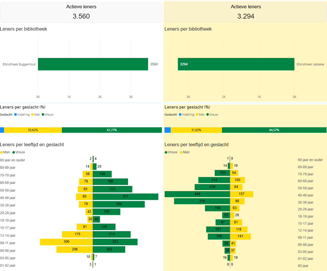 Leners per bibliotheek: het aantal actieve leners uitgesplitst per bibliotheek. Leners zonder ingevuld geslacht worden