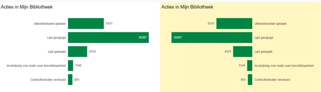 Acties in Mijn Bibliotheek: Het aantal acties in Mijn Bibliotheek, uitgesplitst per type actie. De aantallen zijn de som van alle geselecteerde bibliotheken. De acties zijn: