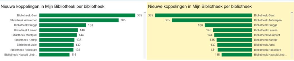 Nieuwe koppelingen in Mijn Bibliotheek per bibliotheek: Het aantal nieuwe kaarten die in Mijn Bibliotheek aan een profiel zijn gekoppeld.
