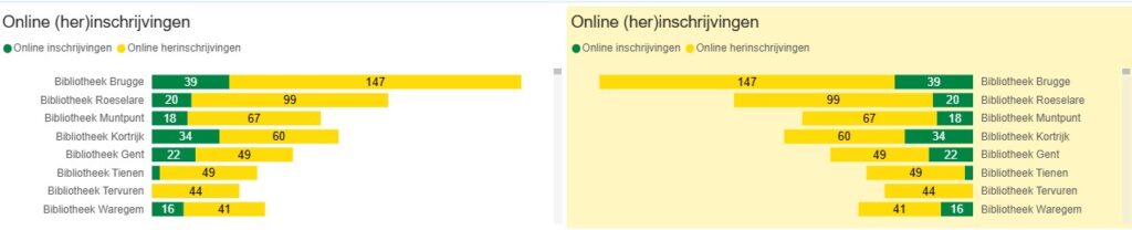 Online (her)inschrijvingen: Het aantal nieuwe online inschrijvingen (groen) en herinschrijvingen (geel) per bibliotheek.