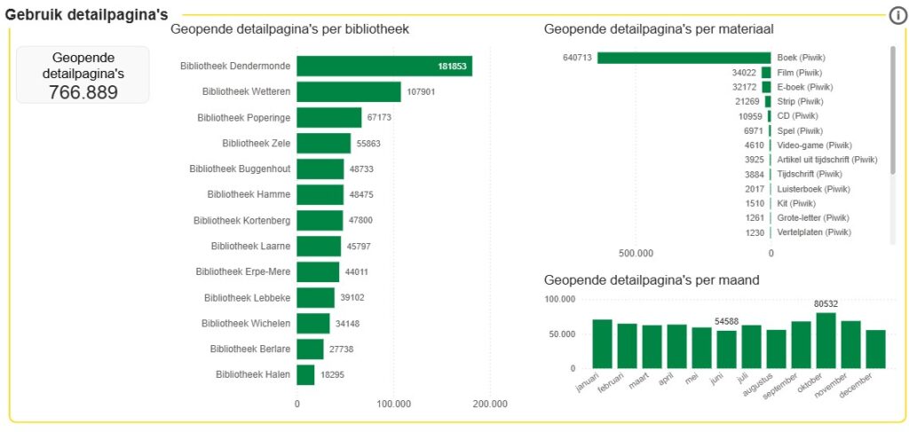 Geopende detailpagina’s per bibliotheek: Totaal aantal detailpagina’s die werden geopend opgesplitst per bibliotheek.