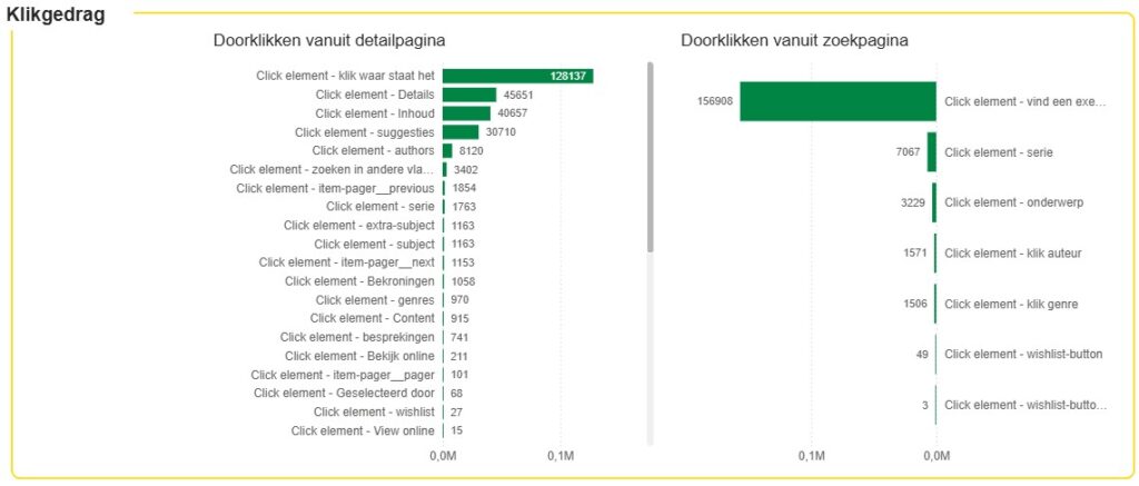 In dit rapport kun je zien welke rubrieken op de zoekresultaten en op de detailpagina’s het vaakst worden aangeklikt. Dit rapport zal na de invoer van de geredesignde catalogus (15 april 2025 voor de meeste bibliotheken) logischerwijze sterk verschillen van de periode er voor. Sommige rubrieken zijn dan immers weggevallen en andere kregen een gewijzigde werking die ook impact heeft op het klikgedrag.