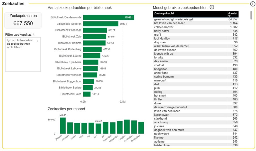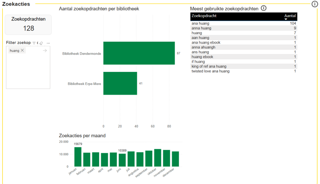Aantal zoekopdrachten per bibliotheek: Aantal ingevoerde zoekopdrachten uitgesplitst per bibliotheek.