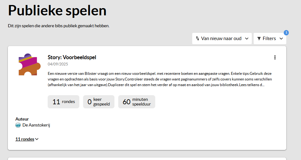 - Ook kan je jouw eigen spelen in Bibster publiek zetten zodat andere bibliotheken hiermee aan de slag kunnen gaan. Ben je trots op een Bibsterspel? Laat het ons weten, dan delen we dat hier graag als good practice!