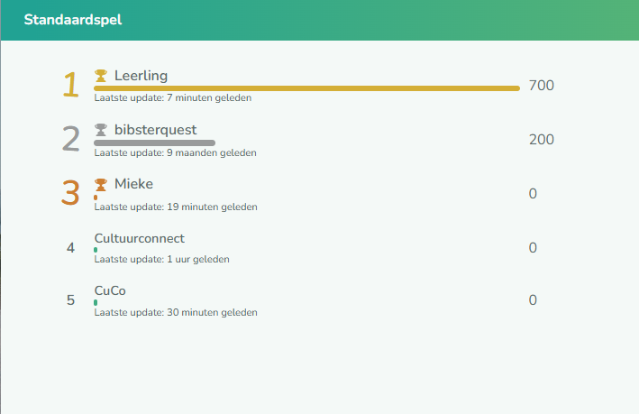 3. Naast het ‘spelersscorebord’ in de app kan een spelbegeleider ook een algemeen (tijdelijk) scorebord beschikbaar maken via een groot scherm gedurende het spel. Vooral bij een Storyspel kan dat voor de spelers een extra motivatie zijn als ze zien hoe de andere teams het doen. Om deze scores up-to-date te tonen, hebben alle teams wel wifi nodig zodat hun antwoorden en punten doorgestuurd kunnen worden naar de back-end van het spel en dus naar het scorebord.