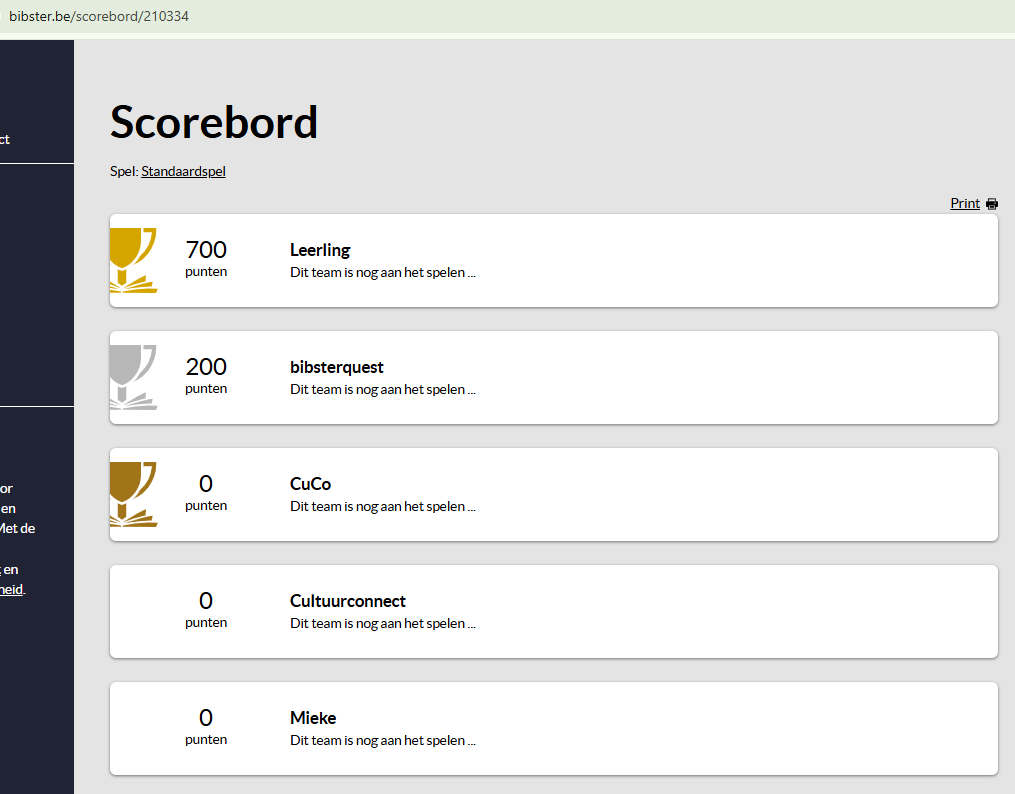Het eindscorebord in de backend kan je ook printen met de printfunctie en op die manier gebruiken als affiche voor de spelers.