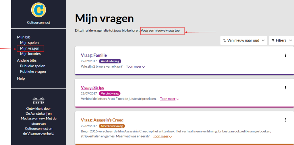 Wil je een vraag toevoegen aan een bestaand spel of een volledig nieuw spel maken, dan is de eerste stap het maken van een nieuwe vraag. Ga naar ‘Mijn Vragen’. Kies hier ‘voeg een nieuwe vraag toe’.