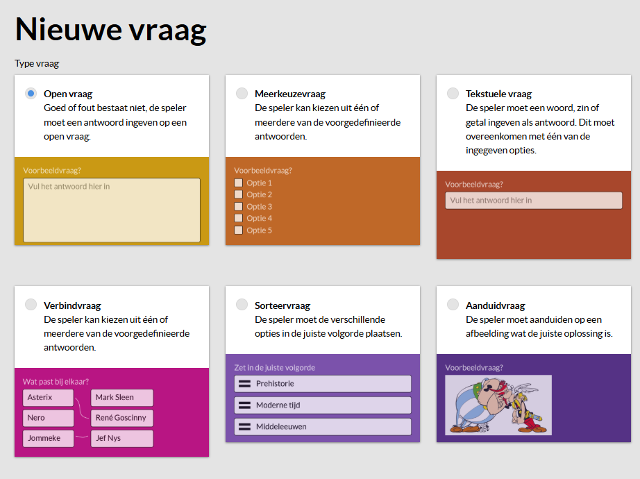 Je krijgt hier de keuze uit zes vraagtypes: een open vraag, meerkeuzevraag, tekstuele vraag, verbindvraag, sorteervraag en een aanduidvraag. Onder elk vraagtype staat een woordje uitleg.