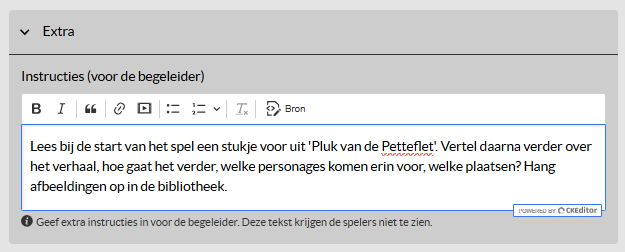 Helemaal onderaan bij extra info kan je nog extra instructies toevoegen. Dit kan nuttig zijn als je met meerdere medewerkers aan een spel werkt. Wanneer je helemaal klaar bent, klik je op ‘Maak mijn nieuwe vraag’.