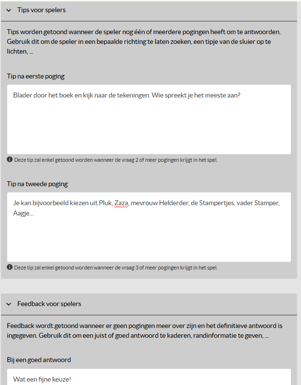 Bij elk vraagtype kan je tips en feedback toevoegen in de vakken onder de vraag. Je vindt hier telkens een woord uitleg bij de mogelijkheden. Tips en feedback toevoegen zijn geen vereiste om het spel te kunnen spelen, maar het maakt de beleving van de spelers wel beter.