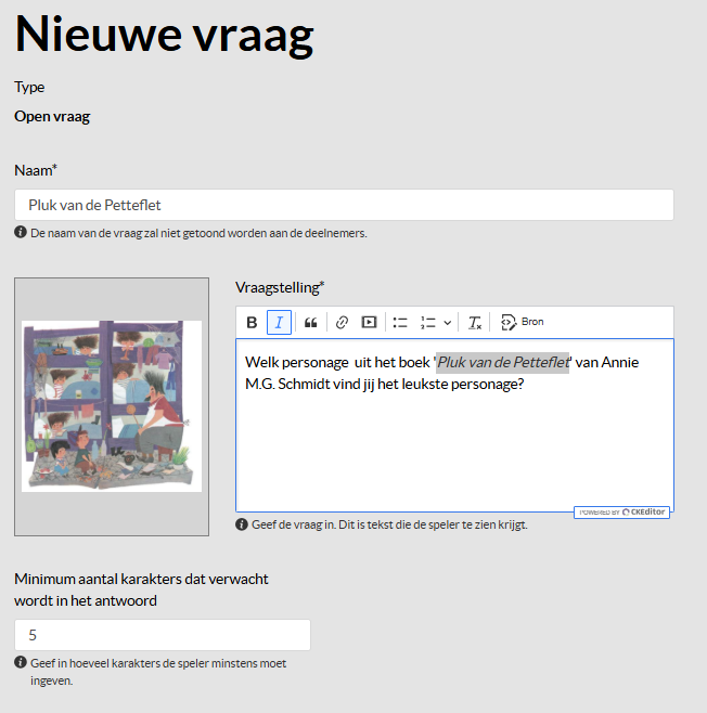 Naast het blok voor de vraagstelling kan je een afbeelding opnemen ter illustratie van je vraag. De illustratie kan door de spelers uitvergroot worden tijdens het spel. We adviseren 1800×1800 pixels als afbeeldingsgrootte.