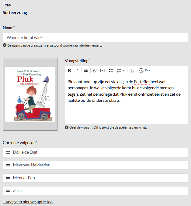 De sorteervraag is vergelijkbaar met de verbindvraag. Hier hoef je enkel de juiste volgorde in te geven. Het systeem zal deze door elkaar gooien tijdens het spel.