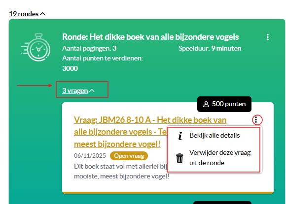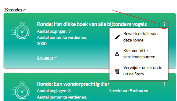 Vanaf nu kan je rondes en vragen afzonderlijk bekijken en aanpassen. Klik op de drie puntjes rechtsboven een ronde om de details van de ronde te bewerken, het aantal punten aan te passen of de ronde te verwijderen uit het spel.