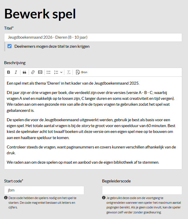 Zodra je een spel van een andere bib hebt gedupliceerd, kan je in een volgend scherm de basisgegevens aanpassen: titel, beschrijving, startcode (deze code hebben de spelers nodig om het spel te starten), begeleiderscode (optionele code, om de voortgang te ontgrendelen wanneer een speler het maximum aantal pogingen bereikt) speelduur, … Kies ‘Maak nieuw spel’ om die gegevens te bevestigen. Je vindt het spel nu ook onder ‘Mijn spelen’.