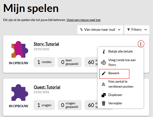 Heb je een eigen spel gedupliceerd en je wil nog een vraag aanpassen, kies dan ‘3 Puntjes’ > ‘Bewerk’.
