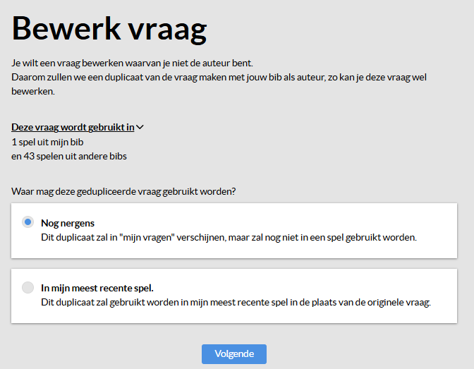 Nadien kom je dan op de bewerk-pagina. Hier krijg je de vraag waar de bewerkte vraag bijgehouden moet worden.