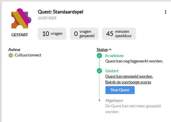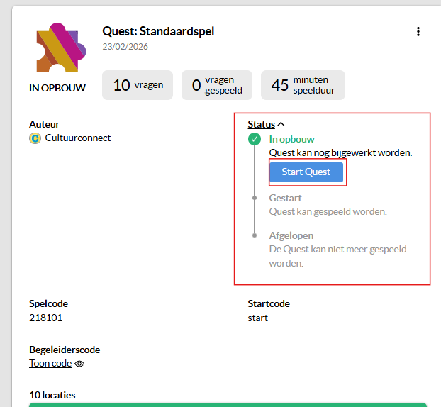 Bij een Quest-spel kan dit bijvoorbeeld het aanvullen van de locaties zijn. Zolang de status op ‘In opbouw’ staat, kan het spel nog niet gespeeld worden. Kies voor ‘Start Quest’ en het spel kan gespeeld worden.